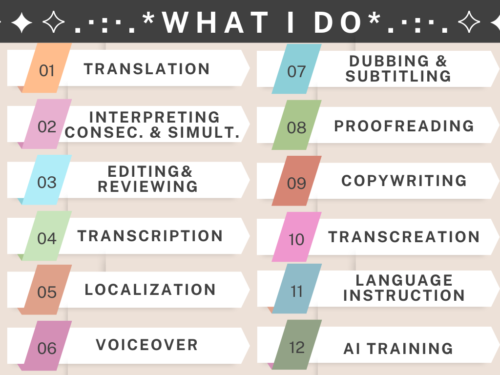 That being said I'm looking forward to facing the next challenge! I'm able to provide accurate renditions and translations to tackle your needs!